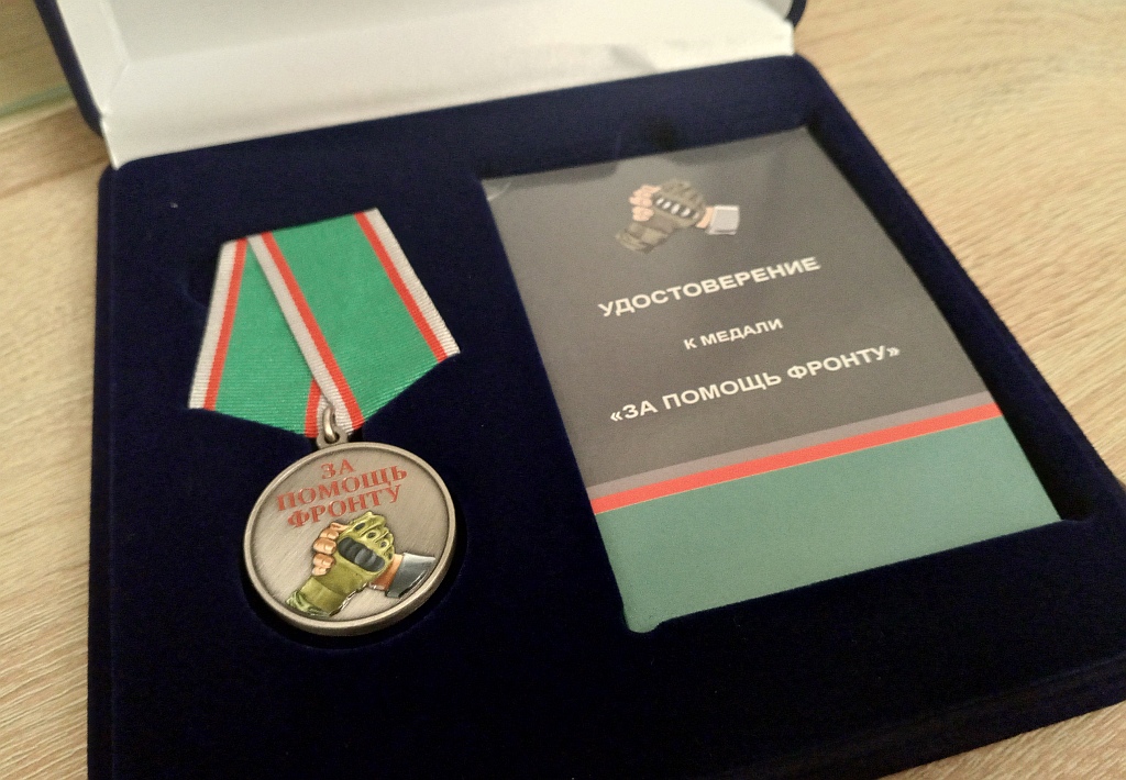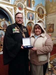 Руководитель волонтёрского движения «#ПомощьСОЛДАТАМ! п.Навля» Громова Яна Алексеевна от имени военнослужащих Херсонского направления передала руководителю координационного центра по добровольческой деятельности при Навлинском благочинии иерею Тимофею Учватову медаль «За помощь фронту», за многократную гуманитарную помощь для их боевого подразделения.