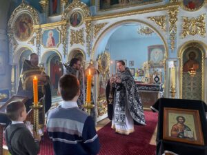 За Божественной литургией были прочитаны сугубые прошения и молитва о Святой Руси. Богослужебные песнопения исполнил хор храма (регент — матушка Ирина Учватова).