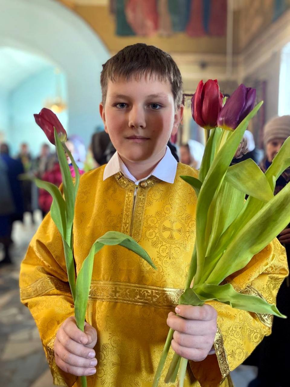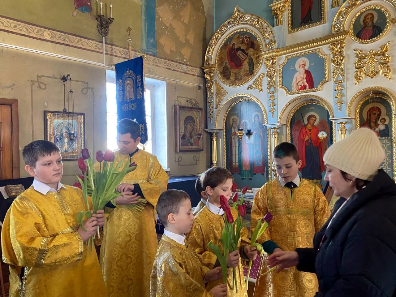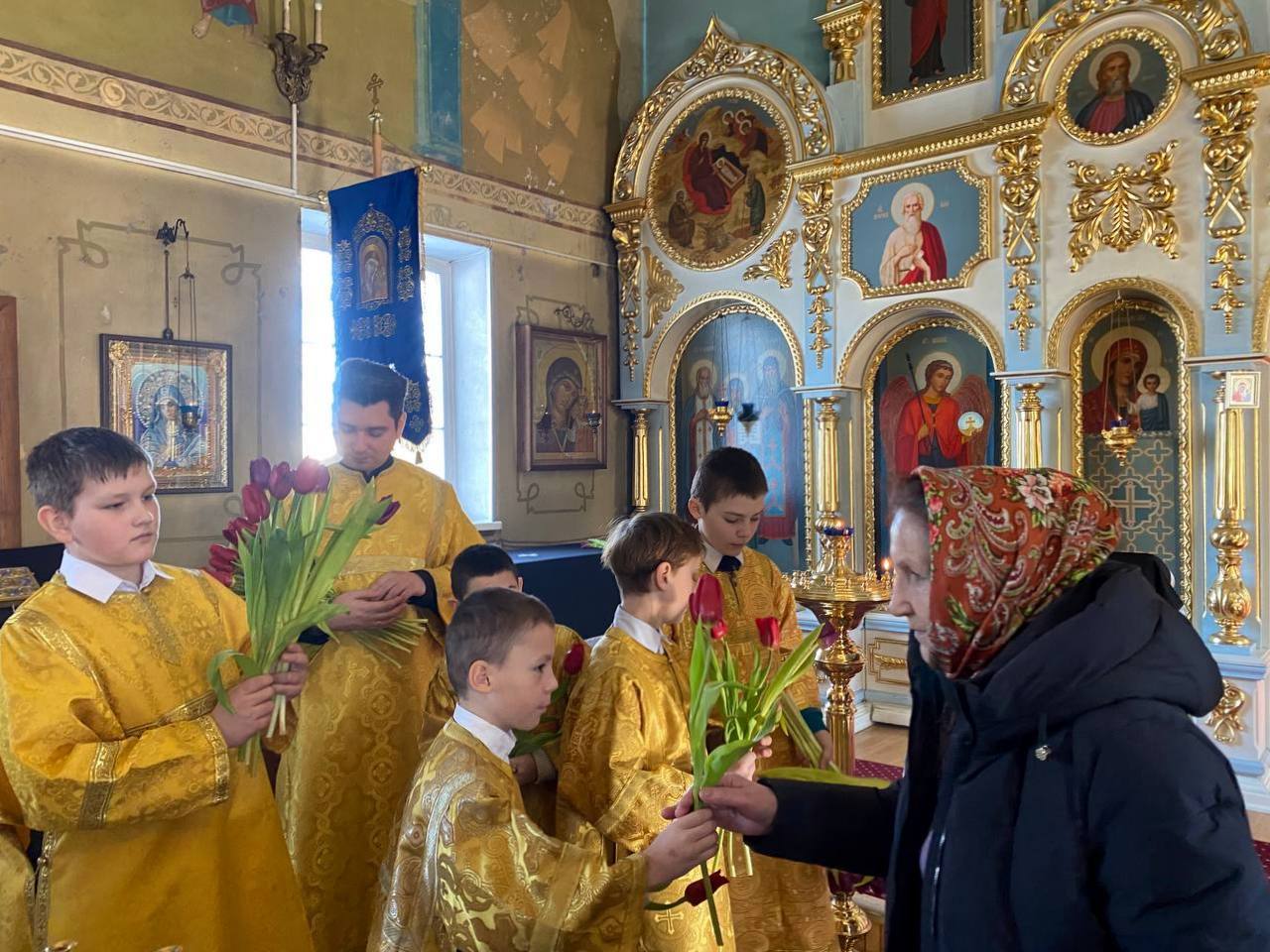 Всем прихожанкам, которые трудятся и несут свои послушания на благо Церкви Христовой, отец Тимофей выразил сердечную благодарность, пожелал помощи Божией, предстательства Пресвятой Владычицы нашей Богородицы и молитвенного её заступничества. Мальчики — воспитанники Воскресной школы вручили всем женщинам живые цветы.