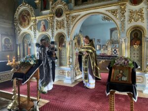 Его Преподобию сослужил клирик Казанского храма иерей Владимир Третьяков. За Божественной литургией были прочитаны сугубые прошения и молитва о Святой Руси.
