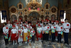 После чего перед всеми присутствующими выступили дети Воскресной школы. Дети под руководством матушки Ирины Учватовой пропели Пасхальные песни и станцевали, а настоятель храма иерей Тимофей Учватов всем детям вручил пасхальные сладости.